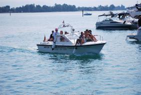 Trotz nicht ganz optimaler Wetterbedingungen – es war zwar warm, aber die Sonne versteckte sich hinter Wolken – bildeten 10 Yachten ein Päckchen, um die Wettbewerbe zu verfolgen. Erfreulicher-weise hatten wir auch wieder Besuch vom MYCÜ aus dem Überlinger See. MYCÜ-Vorstand Martin Lepple, Ressort „Motorbootabteilung“, kam wieder mit drei Wettkampf-teilnehmern und vier Schlachtenbummlern aus dem Überlinger See zum MYCO.